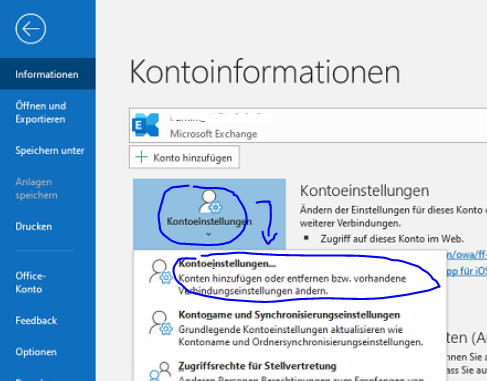 1. Outlook öffnen und unter Datei -> Kontoeinstellungen -> Kontoeinstellungen auswählen